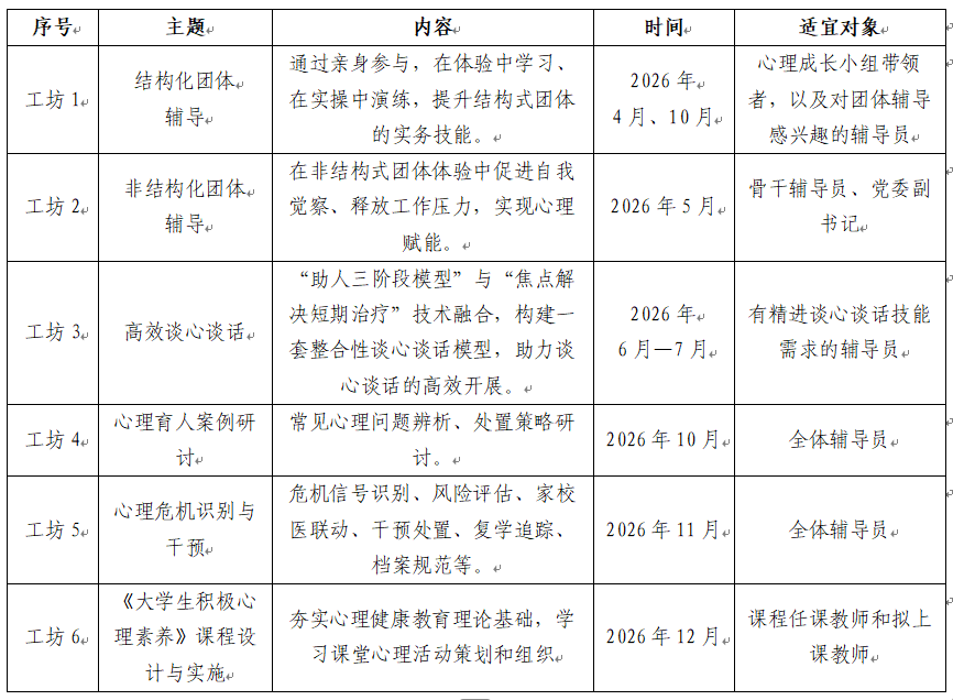 为进一步提升我校辅导员队伍的心理育人能力,增强对学生心理发展的科学认识,掌握对学生心理困扰的干预方法,学生工作处决定组织开展“育心砺能工坊”辅导员心理育人能力提升培训。现将有关事项通知如下: