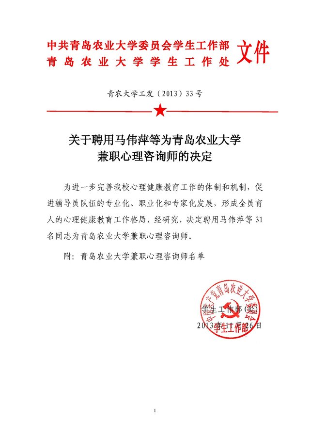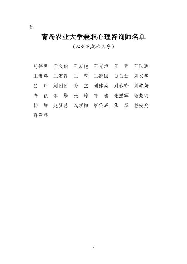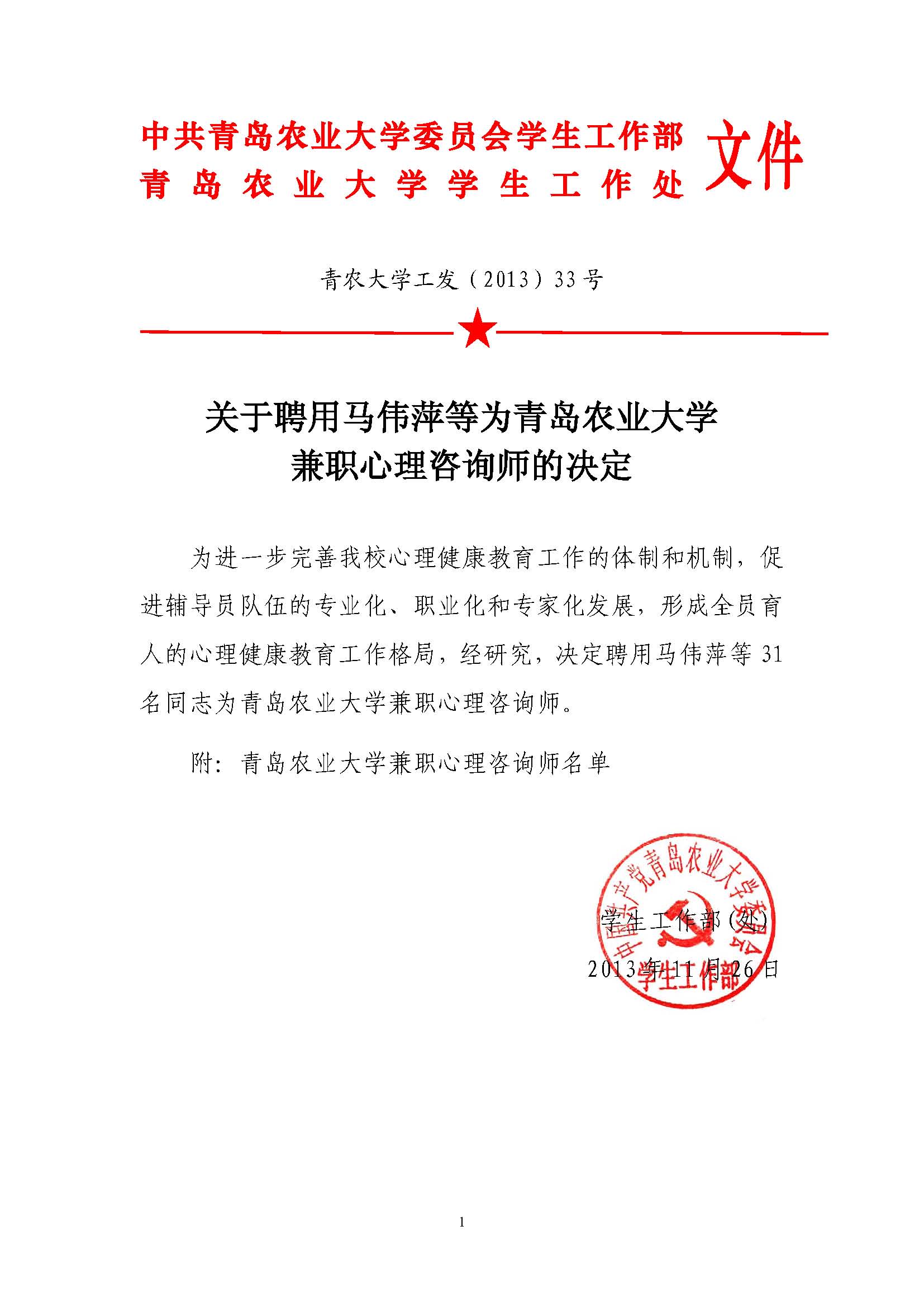 关于聘用马伟萍等为青岛农业大学兼职心理咨询师的决定