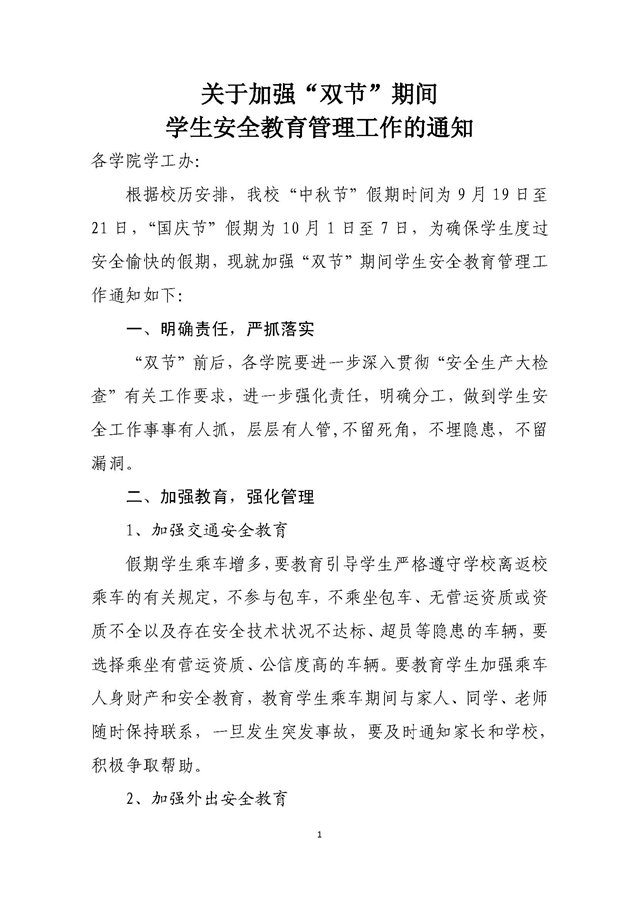 关于加强“双节”期间学生安全教育管理工作的通知