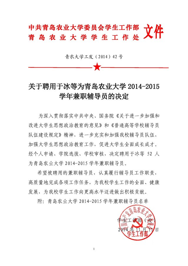 青农大学工发(2014)42号关于聘用于冰等为青岛农业大学2014-2015学年兼职辅导员的决定D