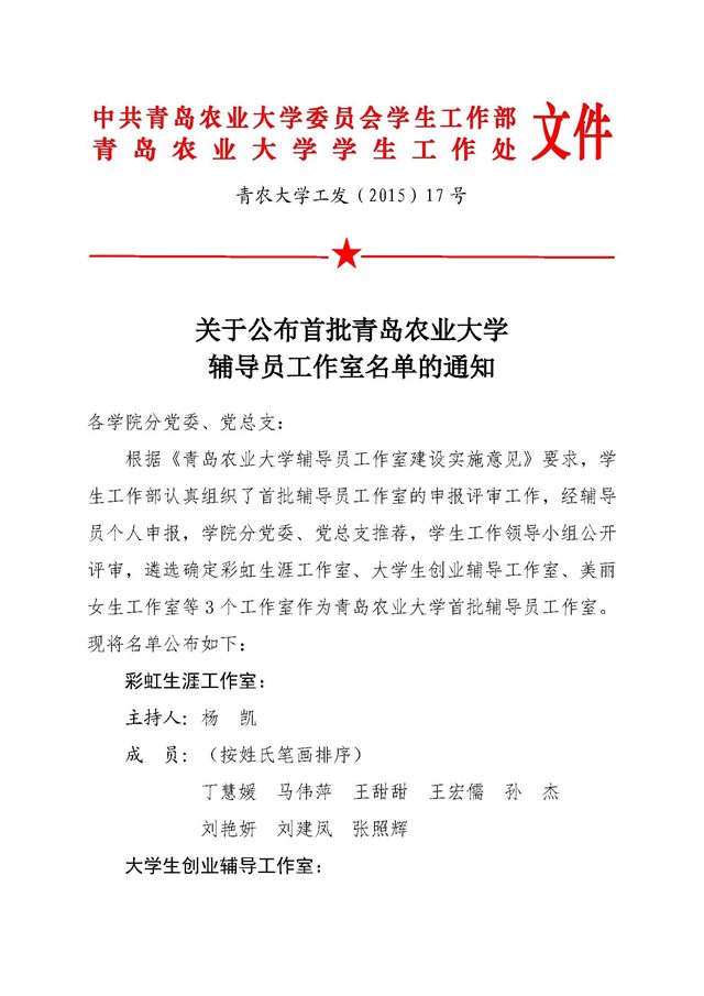 关于公布首批青岛农业大学辅导员工作室名单的通知