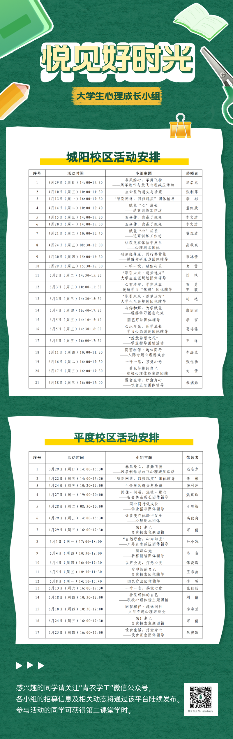 活动以积极心理学为理论指导,涵盖自我探索、人际交往、情绪管理、学业指导、自控力提升、生命教育、自然疗愈等专题。共设38场次,其中城阳校区21场,平度校区17场。具体安排详见活动海报。