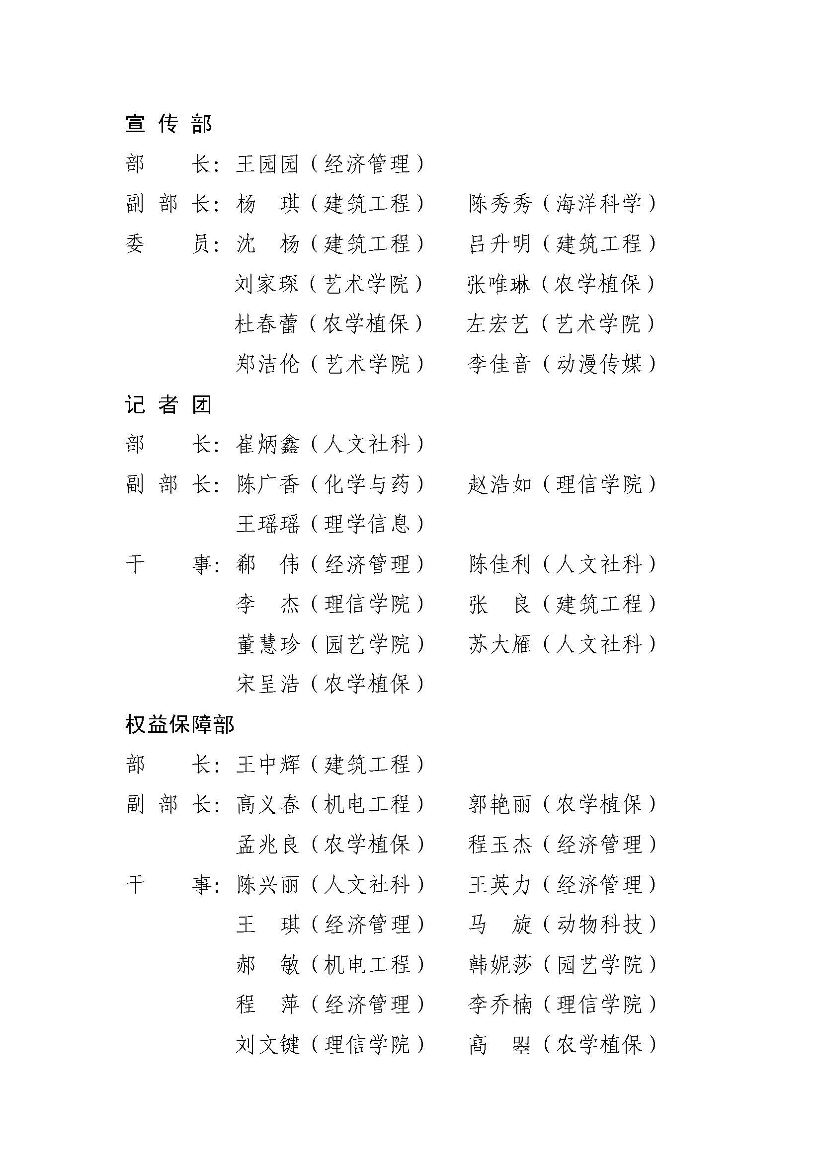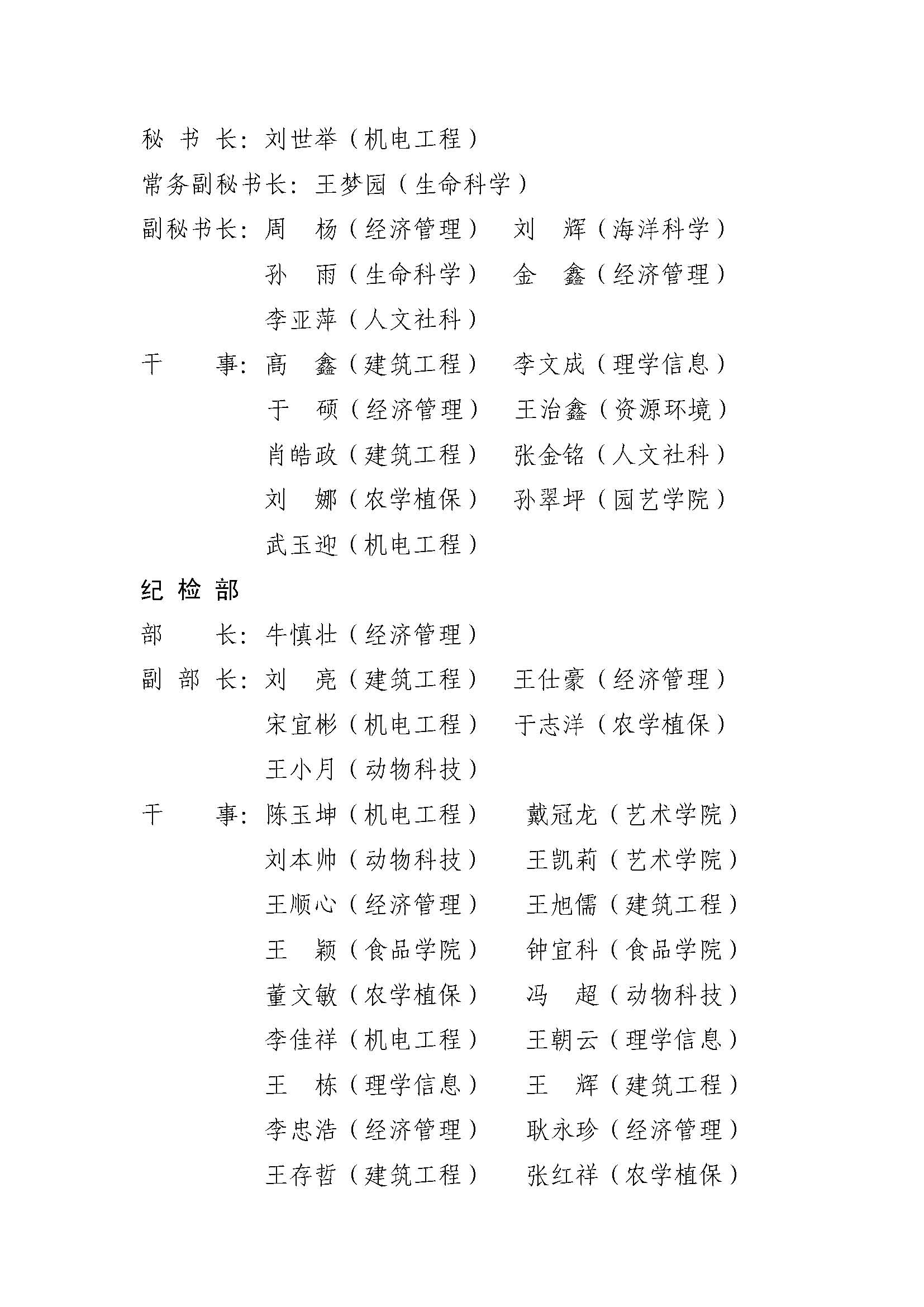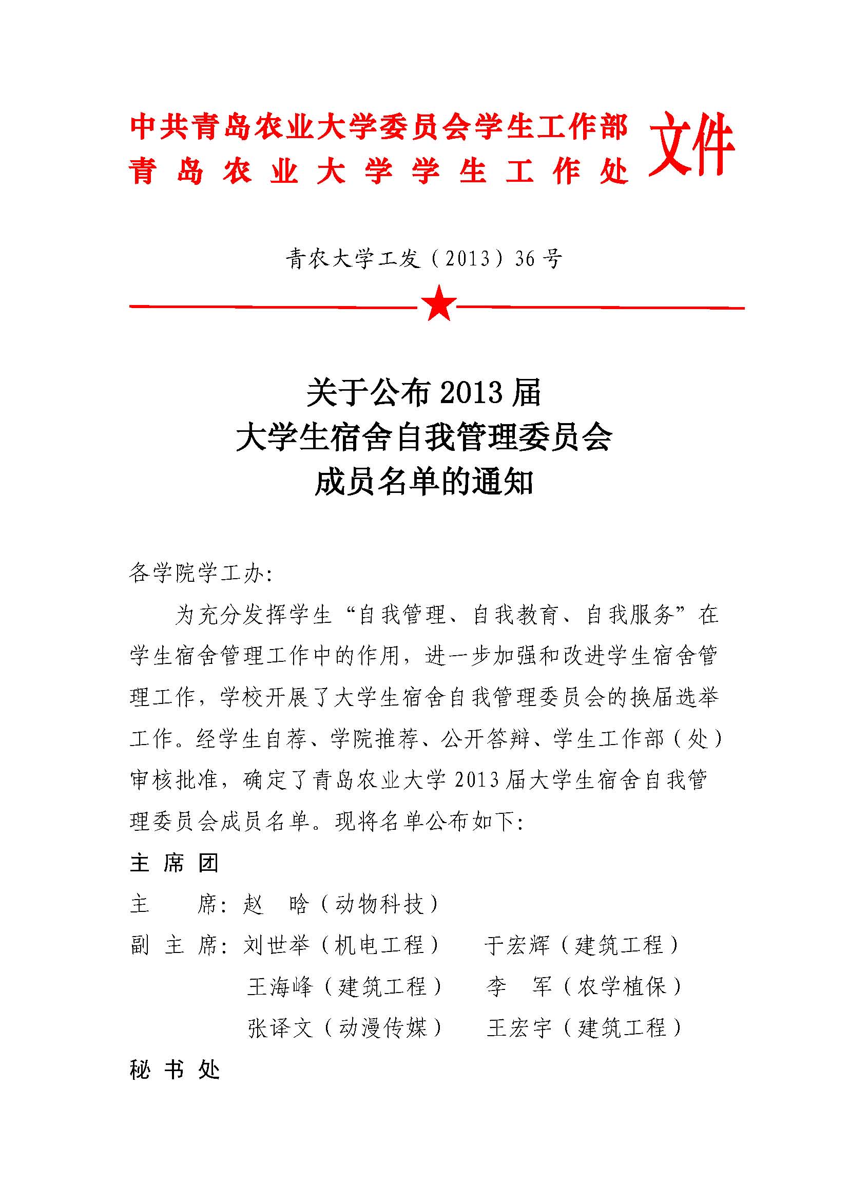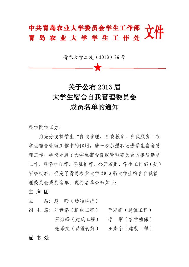 关于公布2013届大学生宿舍自我管理委员会成员名单的通知