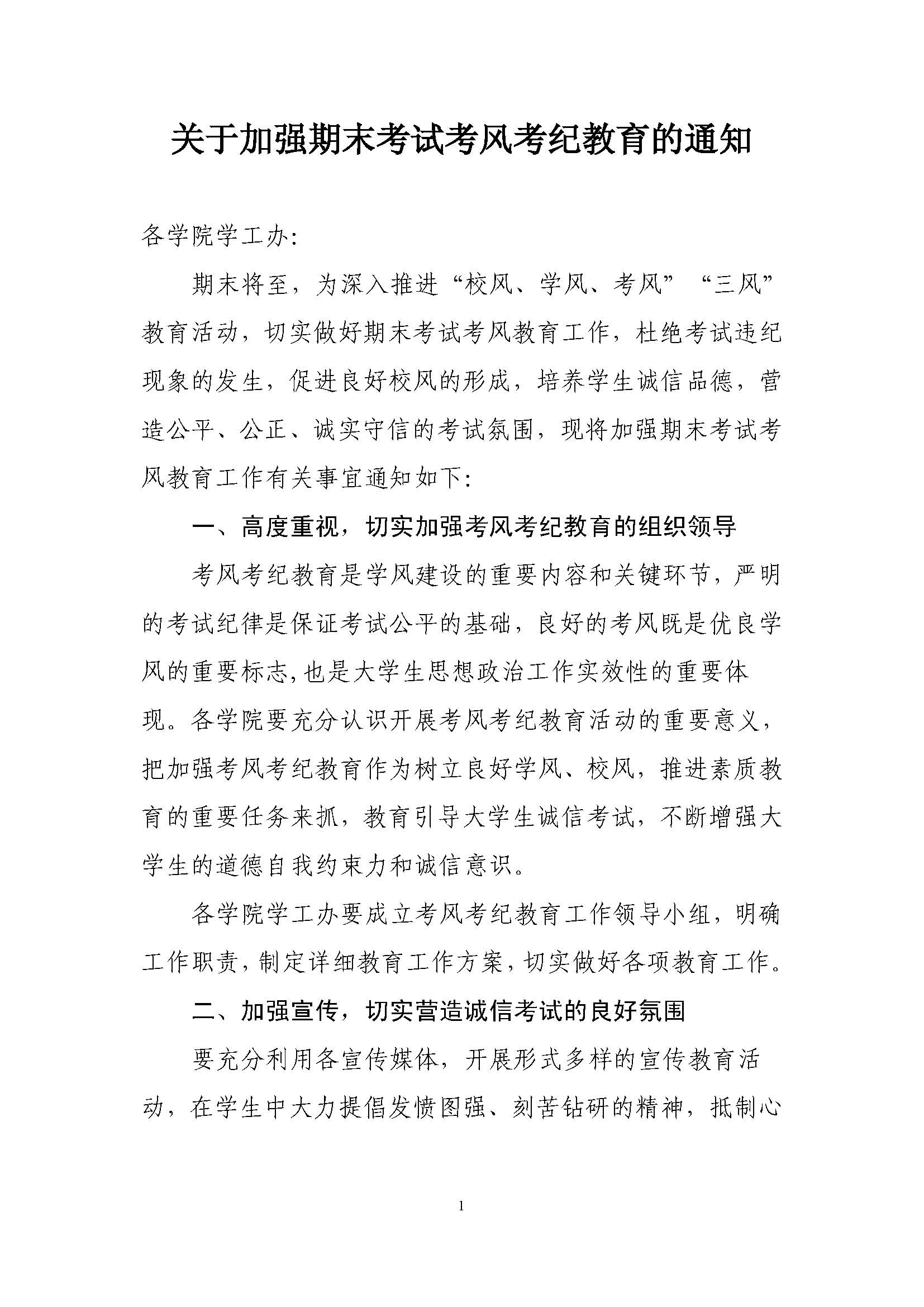 关于加强期末考试考风考纪教育的通知