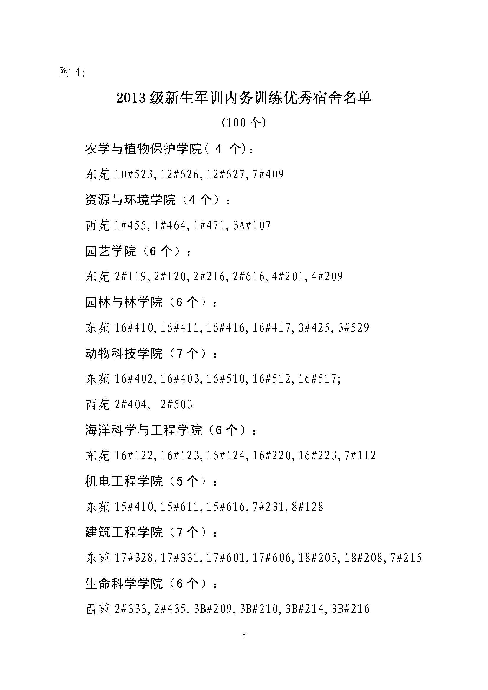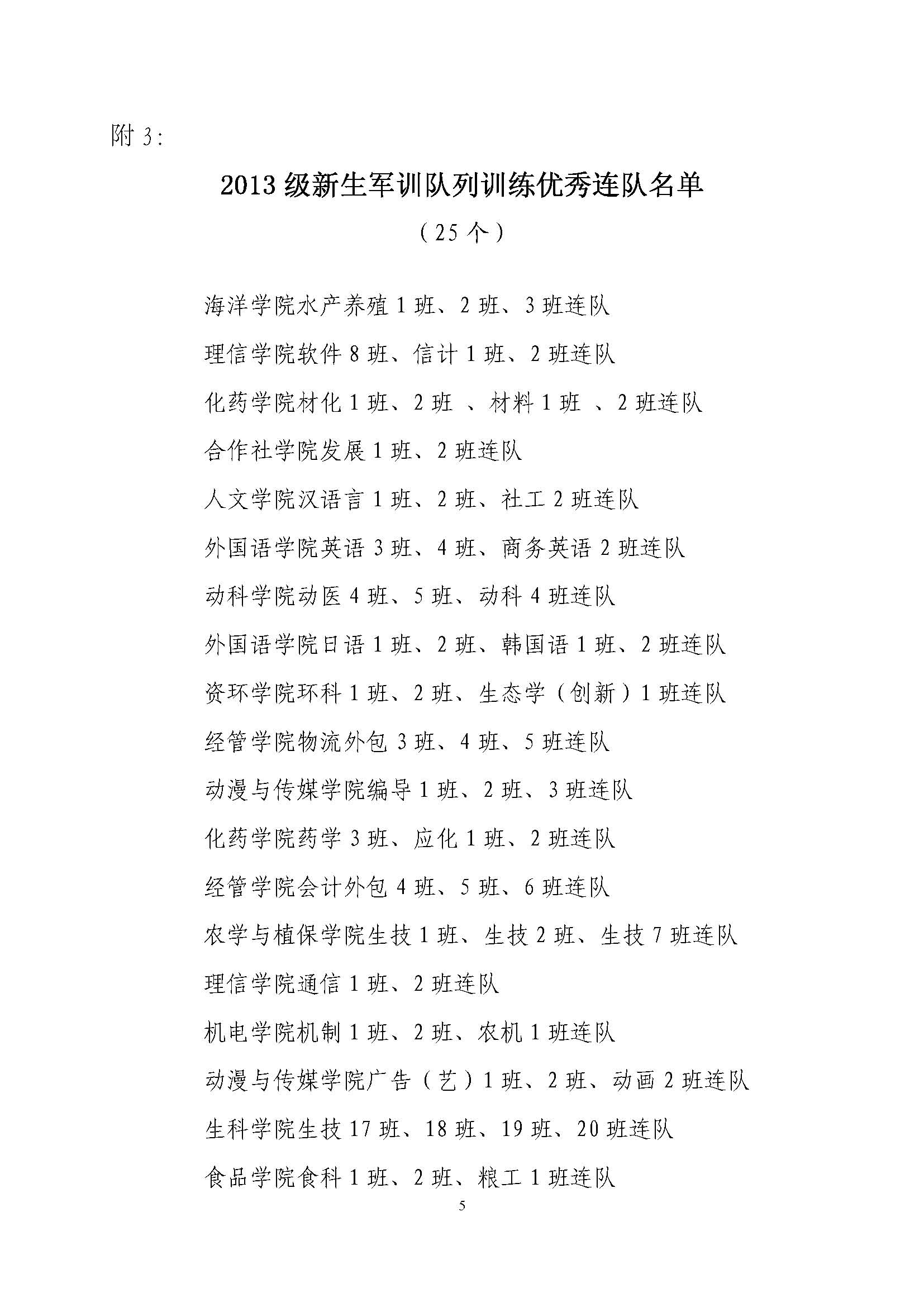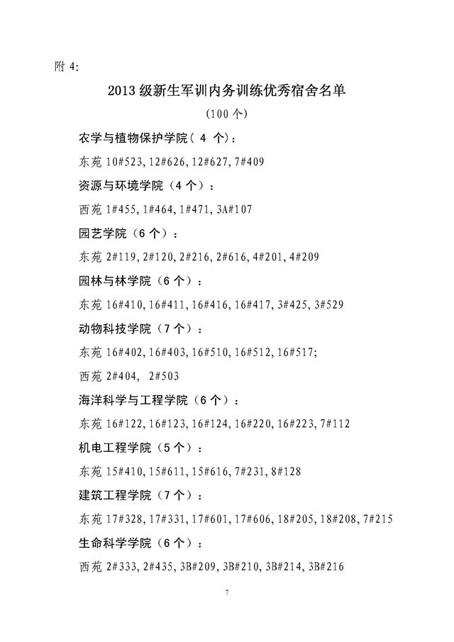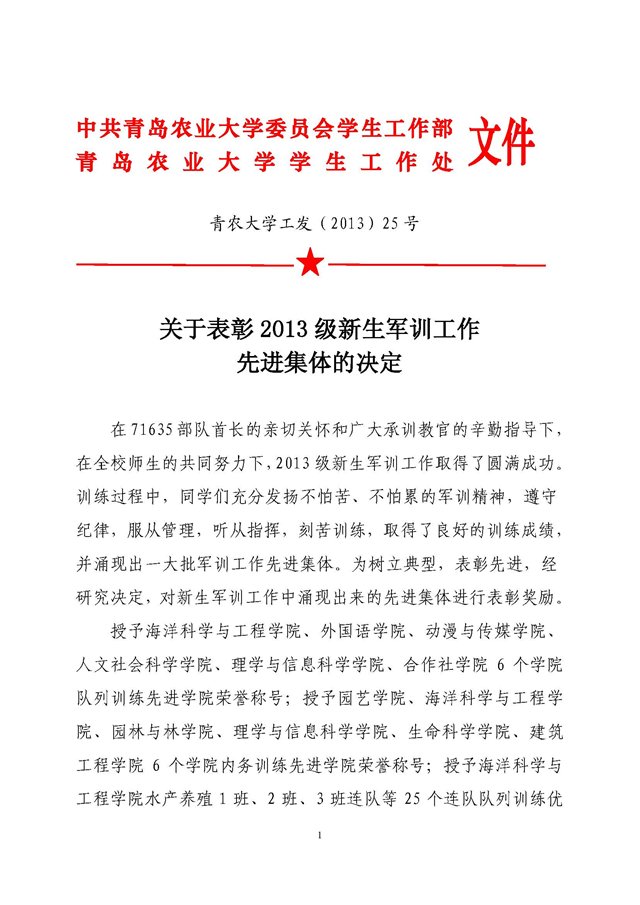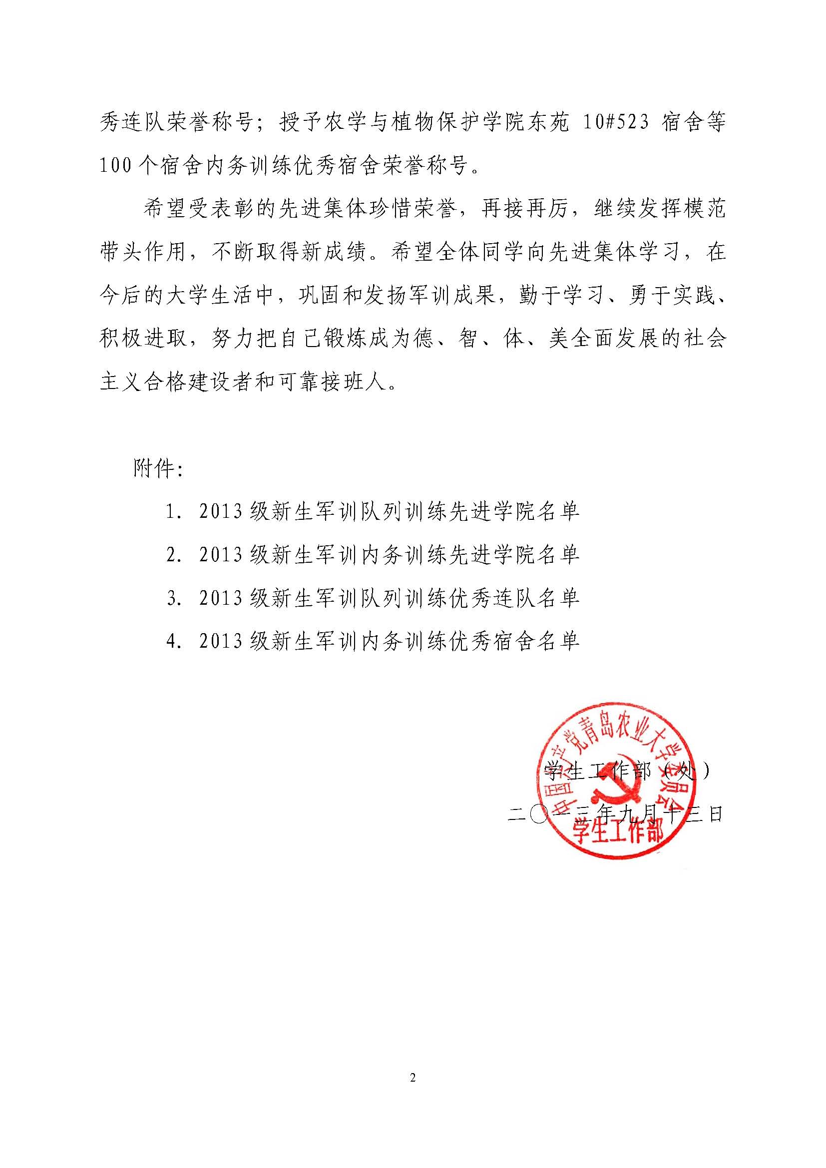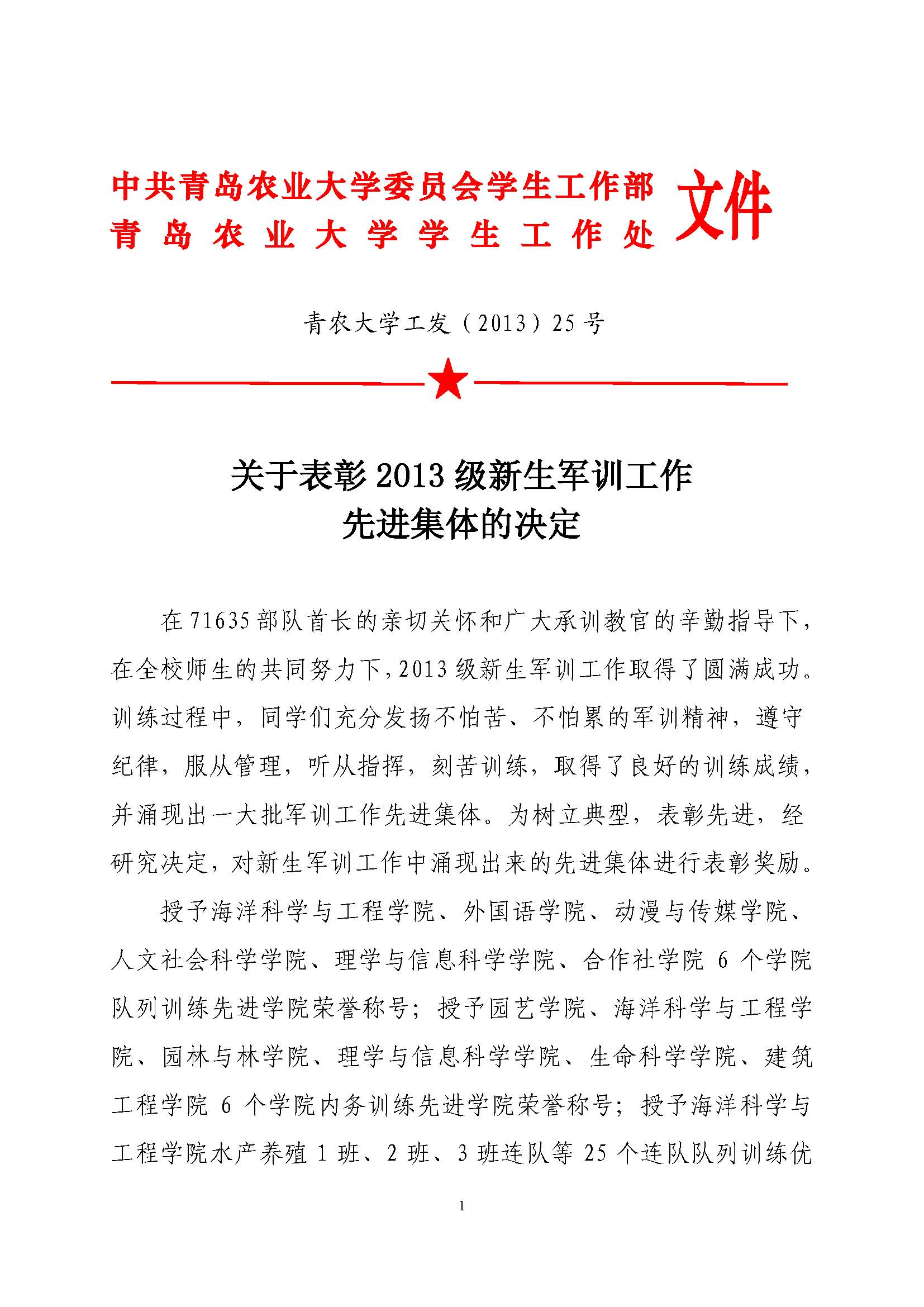 关于表彰二〇一三级新生军训工作先进集体的决定